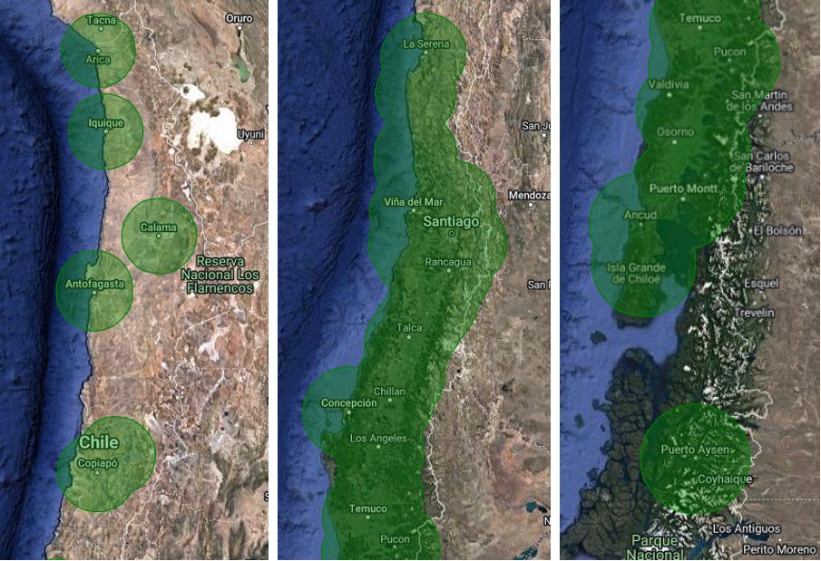 • Las áreas verdes de las imágenes corresponden a las zonas donde podrías desplazarte usando carga de acceso público. Fuera de estas áreas, no podrás desplazarte utilizando únicamente carga de acceso público.